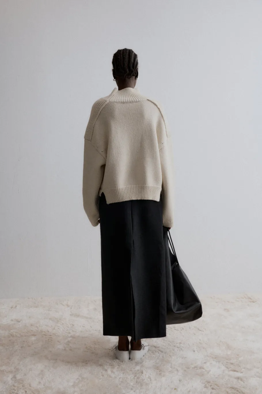 Oat knitted sweater. It has a high, ribbed neckline with a relaxed, oversized fit. The sweater features dropped shoulders and ribbed cuffs. The yoke area has a textured knit pattern, adding a subtle design contrast to the smooth knit on the body. The hem is also ribbed and features a double layer, creating a cozy and comfortable look.