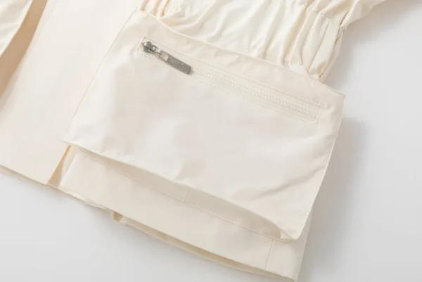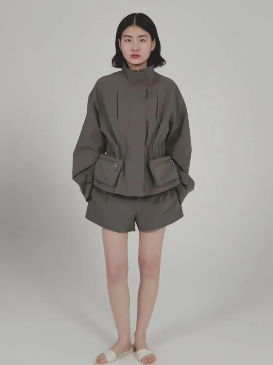 This jacket features a high collar, two front vertical chest pockets. Elastic detail cinches the waist. Below the waist, there are two large patch pockets with zipper closures on either side. Adjustable buckles at the sleeve hems.