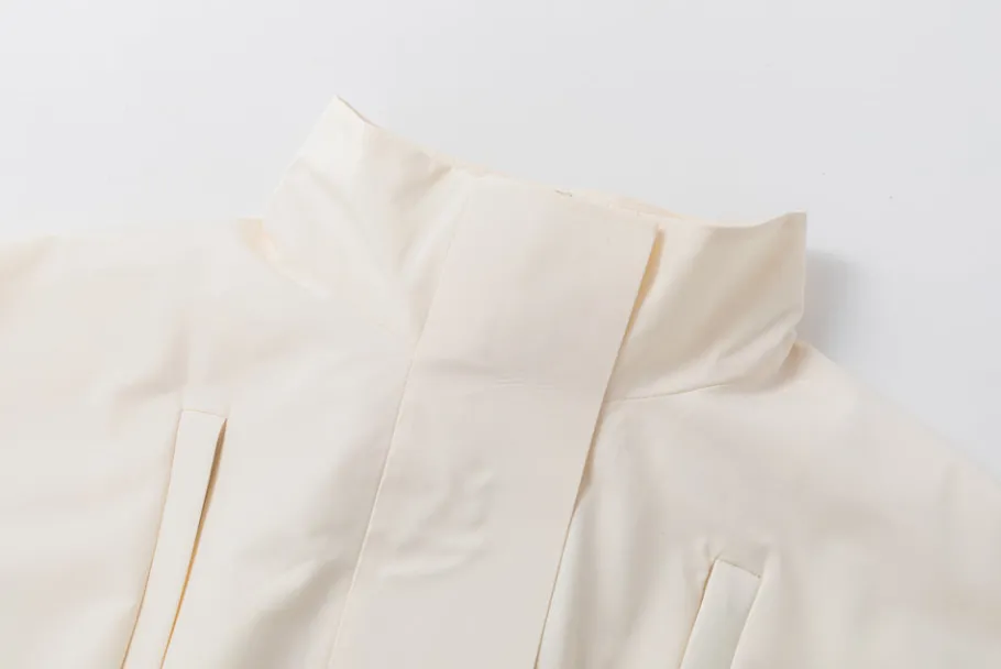This jacket features a high collar, two front vertical chest pockets. Elastic detail cinches the waist. Below the waist,…