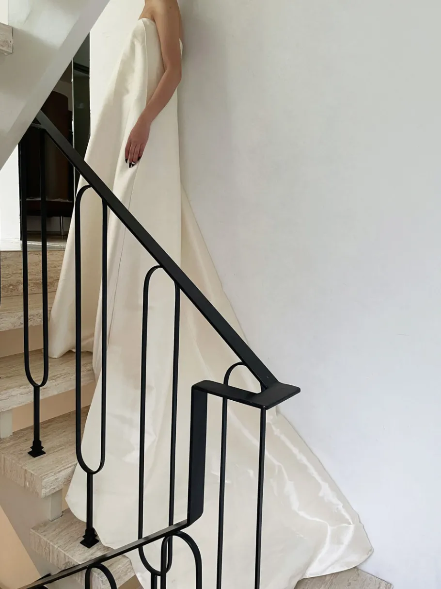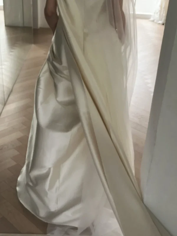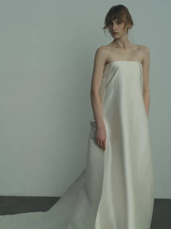 The design features a timeless strapless neckline that gracefully frames the shoulders, flowing into an A-line silhouette with a long train for a dramatic effect. The structured wool and silk blend fabric offers a flattering shape while maintaining a natural flow, while adding a beautiful luster. Creates the perfect classic and royal look! Made on order. Normal delivery time 2-4 months. For more consultation, delivery time and sizing, please contact us at [email protected]