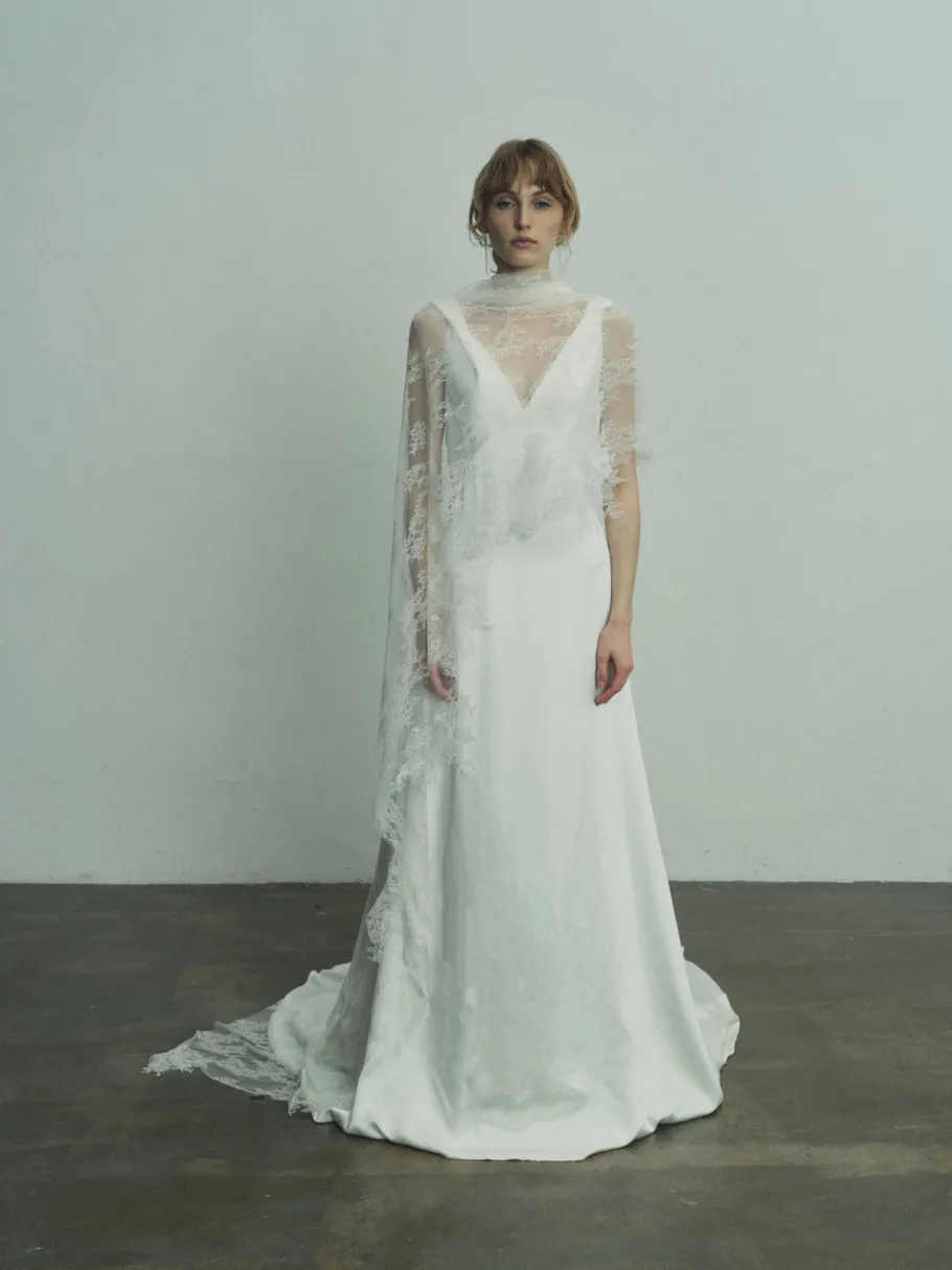 Crafted from ultra-luxurious, 40mm thick, high-shine thick silk. It features a flattering V-neckline with twisted shoulder straps. The gown’s low, draped back adds a touch of allure, while the cut beneath the bust creates a slimming effect, accentuating the waist. The voluminous A-line skirt cascades into a dramatic long train, ensuring a stunning silhouette as you walk down the aisle. Comes with a matching lace cape in a nude color for a softer look. The cape edges are decorated with flower petals and lace-covered buttons.