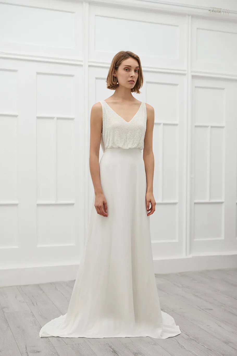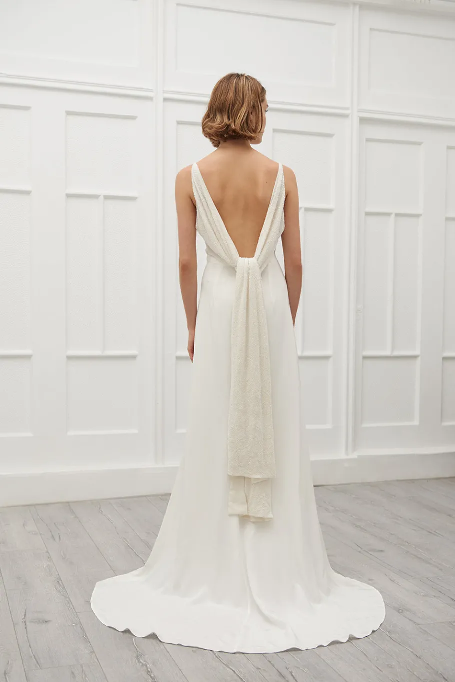 Vivian embedded singled wedding gownThis A- line dress is sleek and has a dramatic knot in the back. The upper part and …