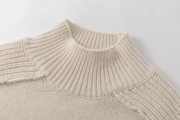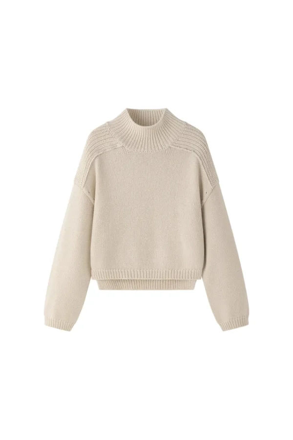 Oat knitted sweater. It has a high, ribbed neckline with a relaxed, oversized fit. The sweater features dropped shoulders and ribbed cuffs. The yoke area has a textured knit pattern, adding a subtle design contrast to the smooth knit on the body. The hem is also ribbed and features a double layer, creating a cozy and comfortable look.