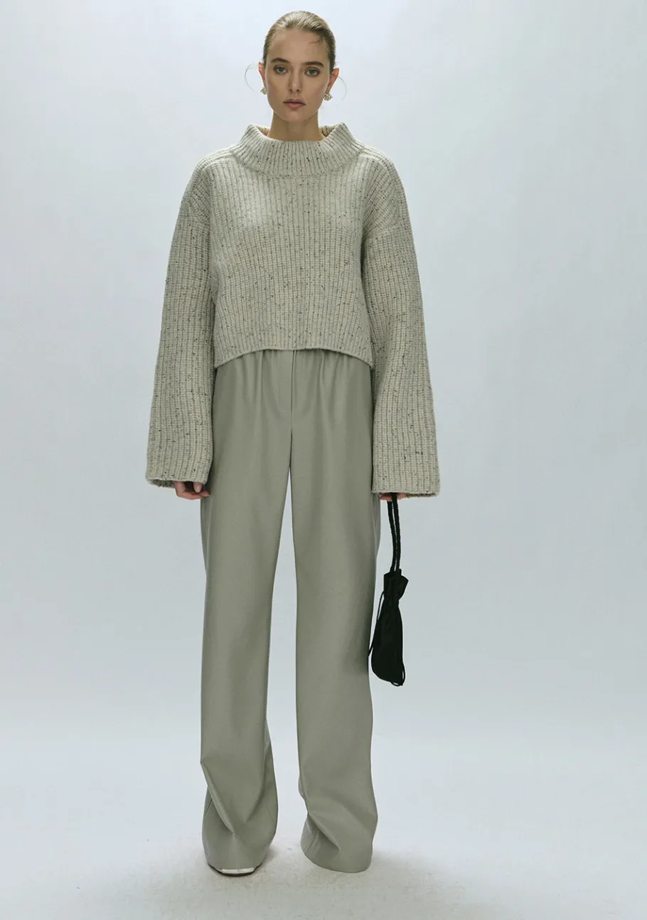 Pullover knitted sweater with wide sleeves and mid raise neckline. Short in style and goes best with higher waist bottoms. Thick sweater in super comfortable wool (not ichy) . Model is 176cm tall and wears size S.