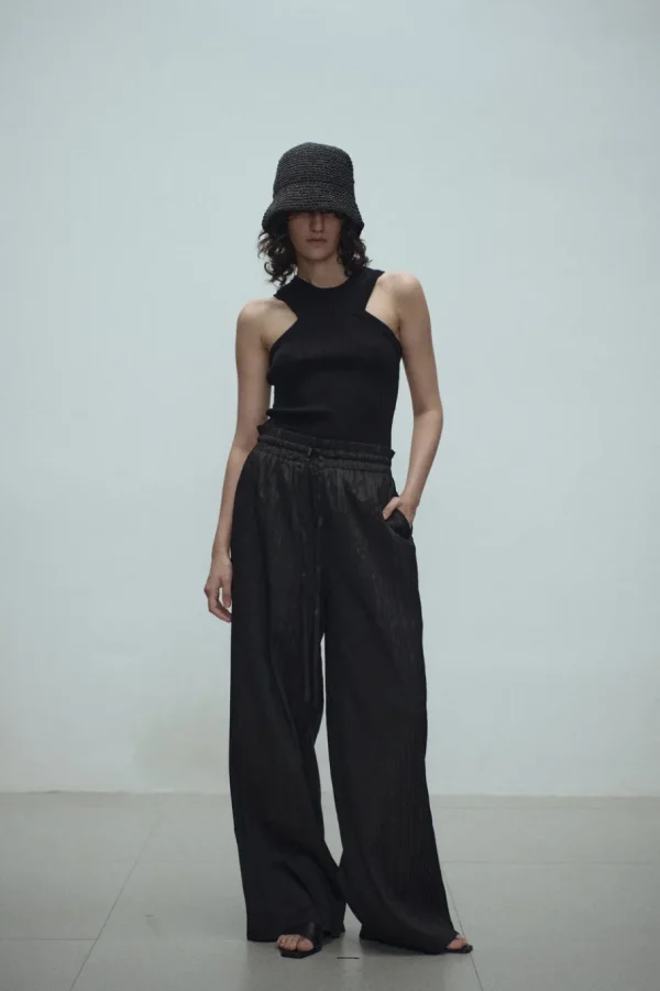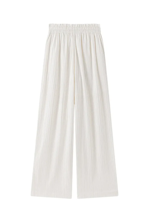 Textured striped trousers. The subtle vertical line texture adds visual interest to the fabric. Wide elastic waistband w…