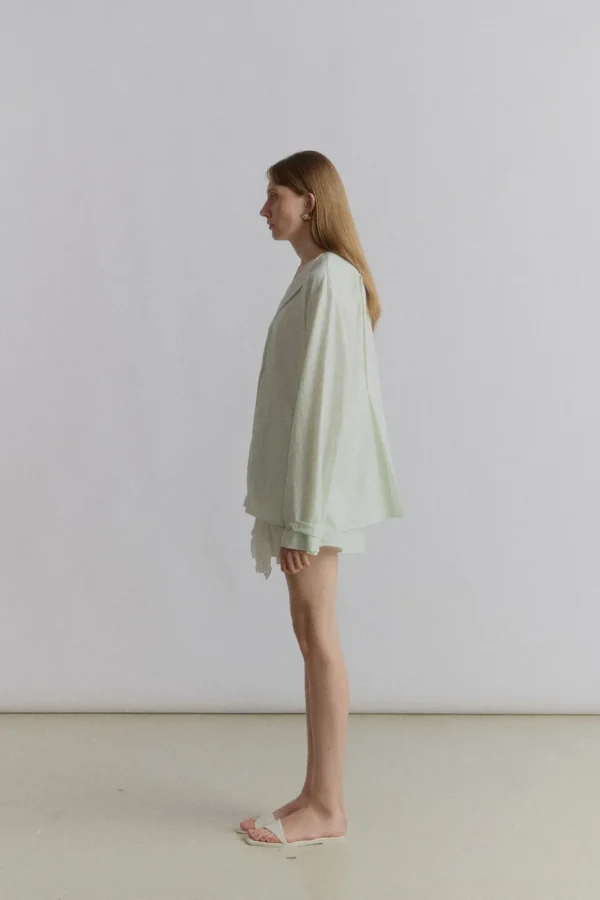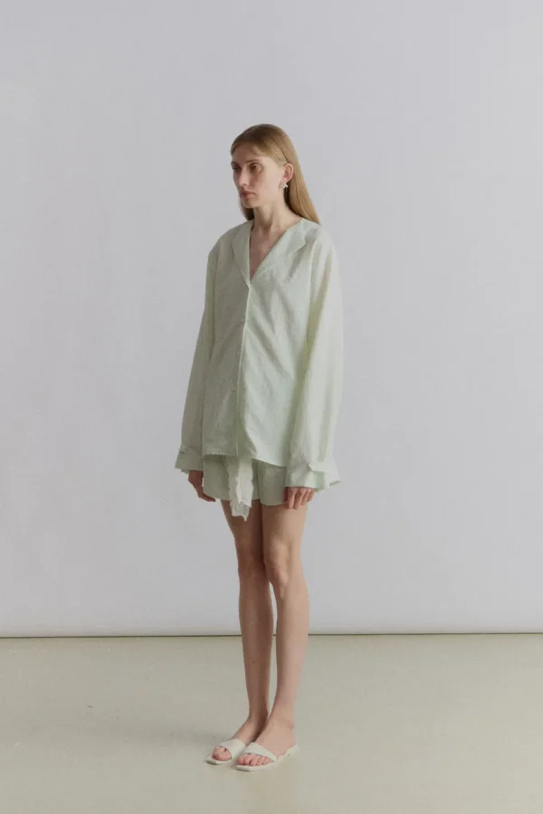 Shirt with blazer collar and pleats in the back and buttoned cuffs. Airy and fresh going shirt of the summer. Style with the matching shorts for a complete bubbly look. Model is 176cm tall and wears size S.56% nylon, 44% rayon.Size recommendation in CM (Not product measurement)XS: Chest 78-82. Waist 63-67. Bottom 88-91S: Chest 83-87. Waist 68-72. Bottom 92-95M: Chest 88-91. Waist 73-77. Bottom 96-99L: Chest 92-96. Waist 78-81. Bottom 100-104Product measurement in CMXS: Chest 118. Length 70.S: Chest 122. Length 71.5.M: Chest 126. Length 73.L: Chest 130. Length 74.5.